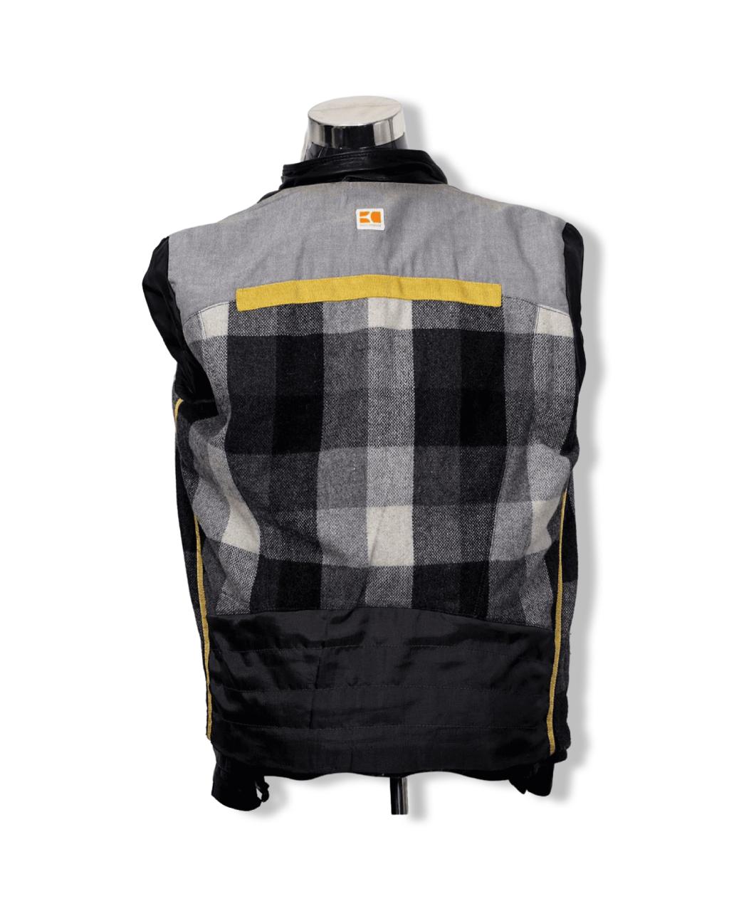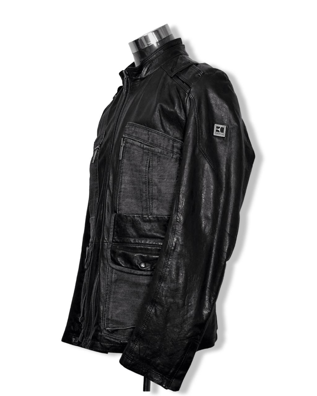 Hermosa Chaqueta 3/4 de Cuero con Aplicaciones de Mezclilla Gris en los 4 Bolsillos delanteros. Talla L